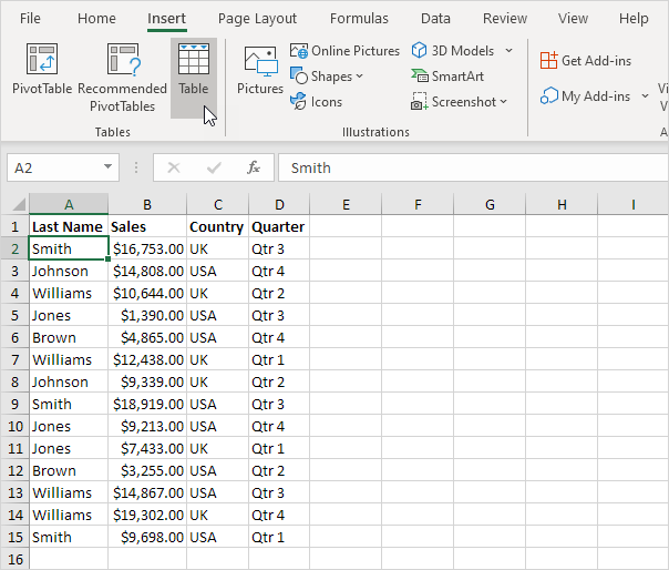 بیایید با استفاده از نوار ریبون، یک جدول ایجاد کنیم. جدول به شما این امکان را می‌دهند که بتوانید به سرعت و خیلی راحت اطلاعات خودتان را در اکسل پردازش کنید.