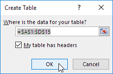 • اکسل به صورت خودکار تمام مجموعه داده ای که وارد کرده‌اید را انتخاب می‌کند. تیک گزینه My table has Headers را بزنید.