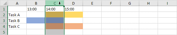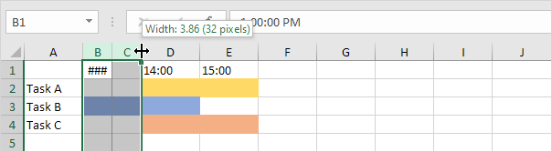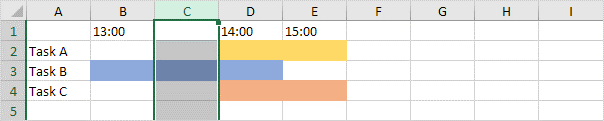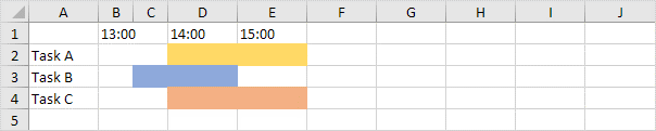 اکنون فرض کنید که تسک B در سال ۱۳:۳۰ شروع شود در این صورت باید سلول B3 را به دو قسمت تقسیم کنید و تسک مورد نظر از بخش دوم شروع شود.