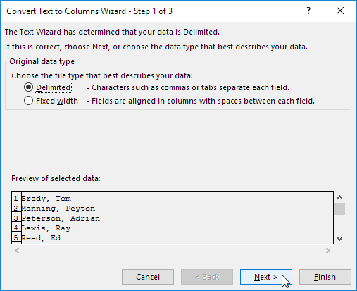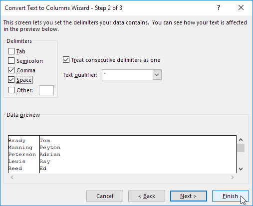 توجه کنید: در این مثال کاماها (Commas) و فاصله (Spaces) به عنوان جدا کننده (Delimiters) معرفی شده اند. ممکن است که شما بر حسب داده های خودتان مجبور به استفاده از جداکننده های دیگری باشد. شما می توانید گزینه های دیگر را با انتخاب چک باکس های آن ها بررسی کنید. یک پیش نمایش از داده ها بعد از اعمال جدا کننده به شما نمایش داده می شود.