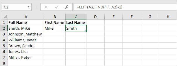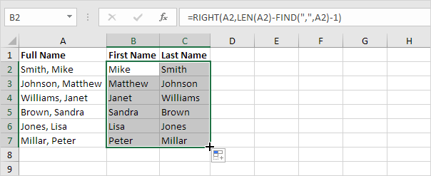برای تقسیم کردن یک سلول به چند سلول می توانید از ویزارد Text to Columns استفاده کنید. برای مثال، بیایید نام های کامل در مثال زیر را به نام خانوادگی و نام اصلی افراد تقسیم کنیم.
